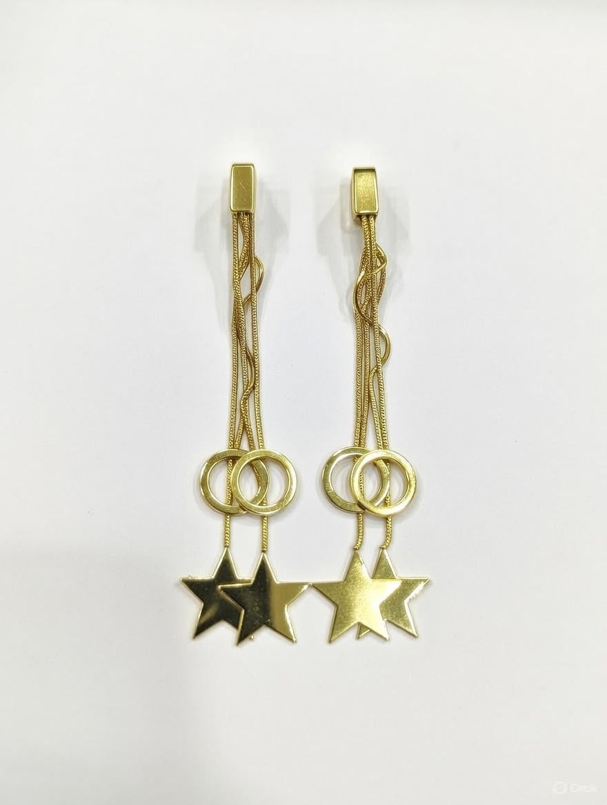 Add a modern celestial touch to your look with the Celestial Star Chain Drop Earrings. Designed with a sleek gold-tone finish, these earrings feature delicate layered chains, interlinked rings, and elegant star charms that create graceful movement with every step.
