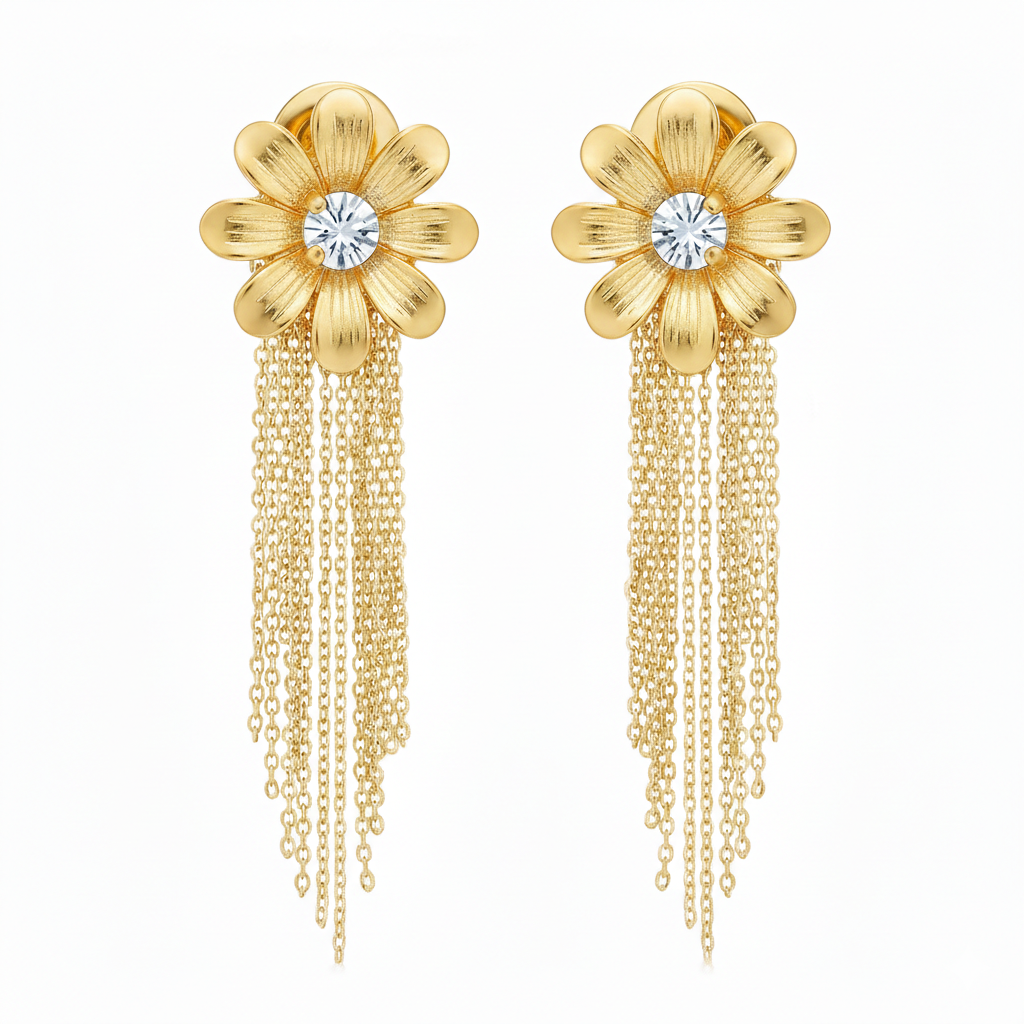 levate your style with the graceful charm of the Golden Bloom Tassel Drop Earrings. Designed with a delicate floral motif, these earrings feature a sparkling crystal center that adds a subtle shimmer, perfectly complemented by cascading gold-tone chain tassels.