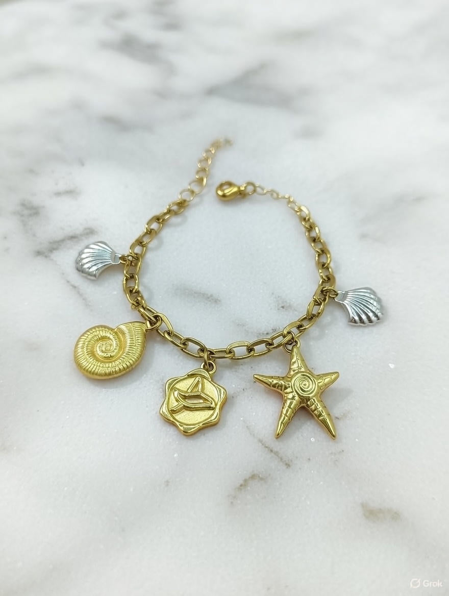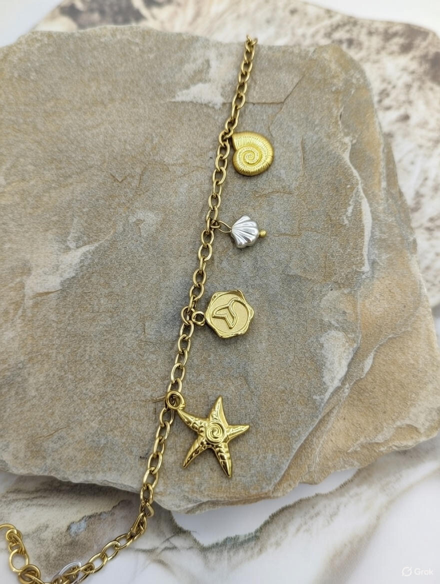 Shop gold sea shell & starfish charm anklet for women. Adjustable, lightweight ankle bracelet perfect for beachwear and daily styling. Gold-tone anklet featuring sea shell and starfish charms. Lightweight, adjustable, and perfect for everyday wear or beach styling.